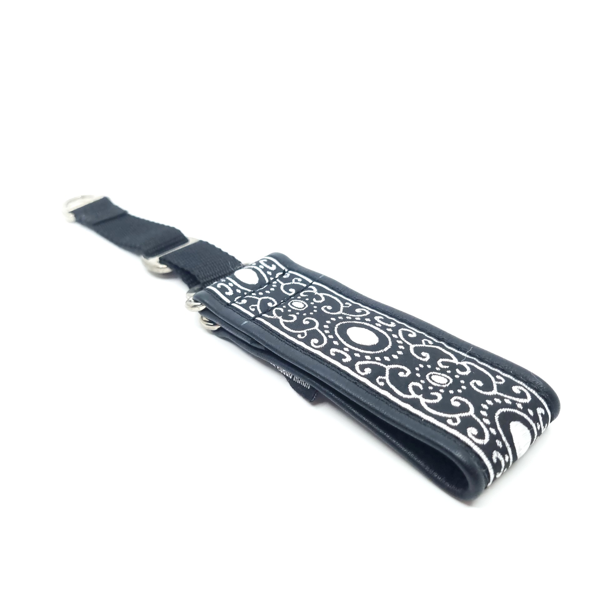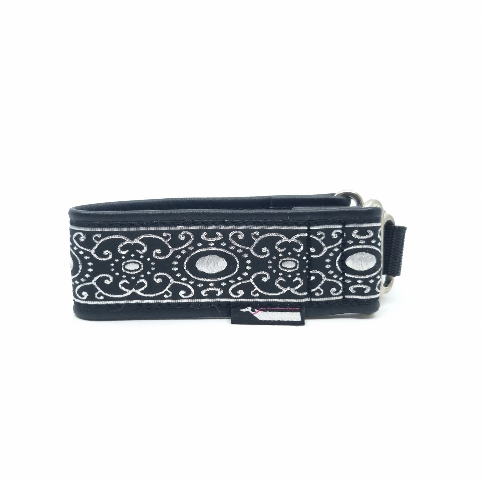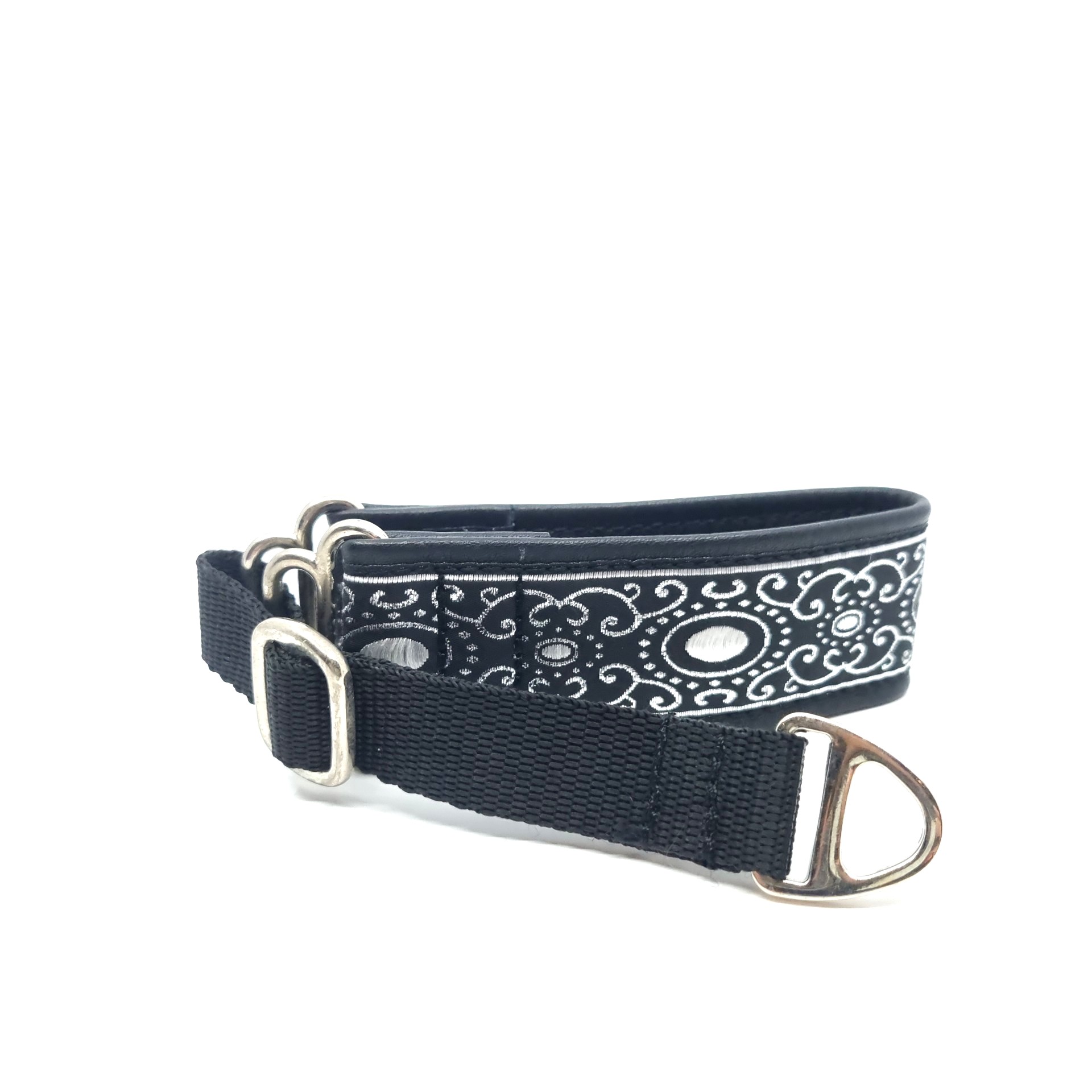 Ge din hund både stil och komfort med vårt breda halvstryphalsband, tillverkat i förstklassigt läder och dekorerat med ett vackert påsytt textilband. Den robusta konstruktionen ger en trygg och behaglig passform, samtidigt som den dekorativa designen gör halsbandet till ett riktigt blickfång.
