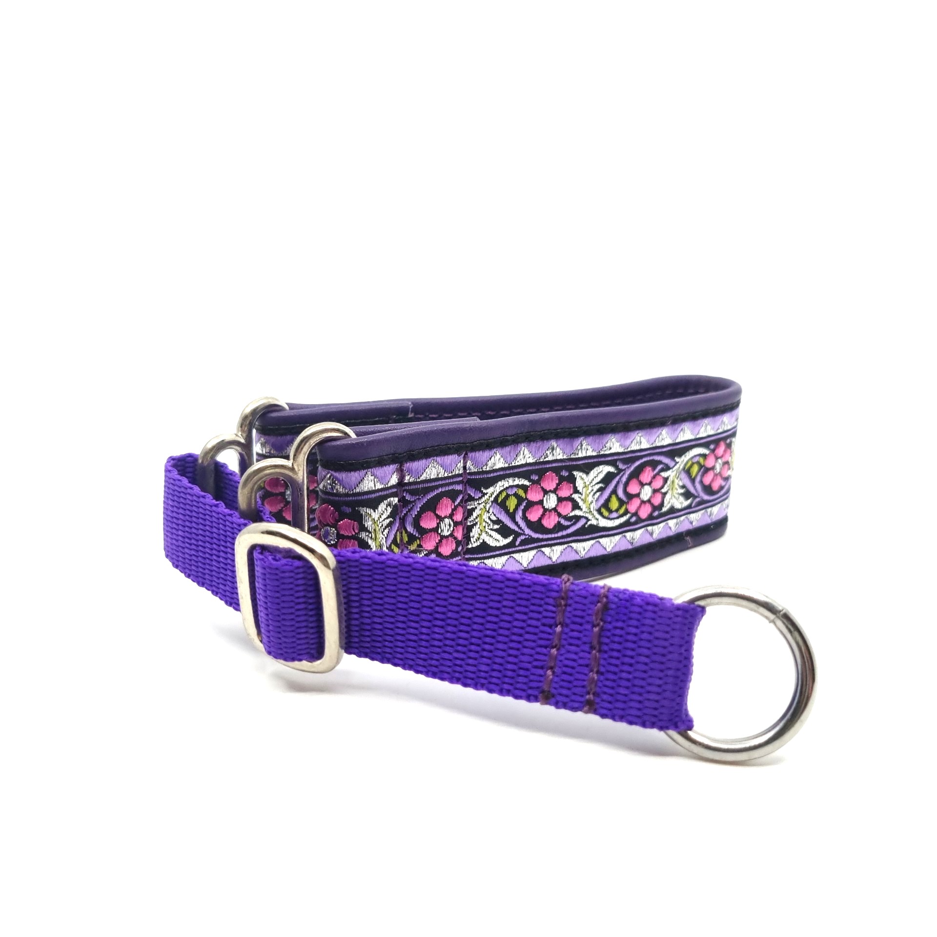 Ge din hund både stil och komfort med vårt breda halvstryphalsband, tillverkat i förstklassigt läder och dekorerat med ett vackert påsytt textilband. Den robusta konstruktionen ger en trygg och behaglig passform, samtidigt som den dekorativa designen gör halsbandet till ett riktigt blickfång.