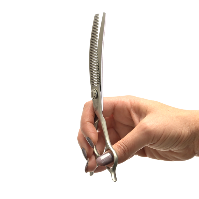 Effileringssaxen används för att tunna ur din hunds päls, för att skapa en fin finish och för att jämna till ojämnheter eller övergångar. Den böjda passar utmärkt till att skapa mjuka, rundade former.